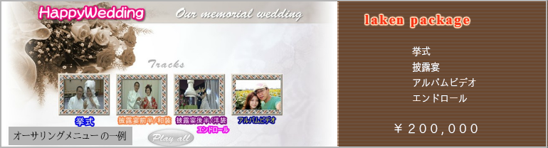 - 「挙式」から「披露宴」、「アルバムビデオ 二つの軌跡」、そして「エンドロール」までメニューにまとめた、ラーケンパッケージ。